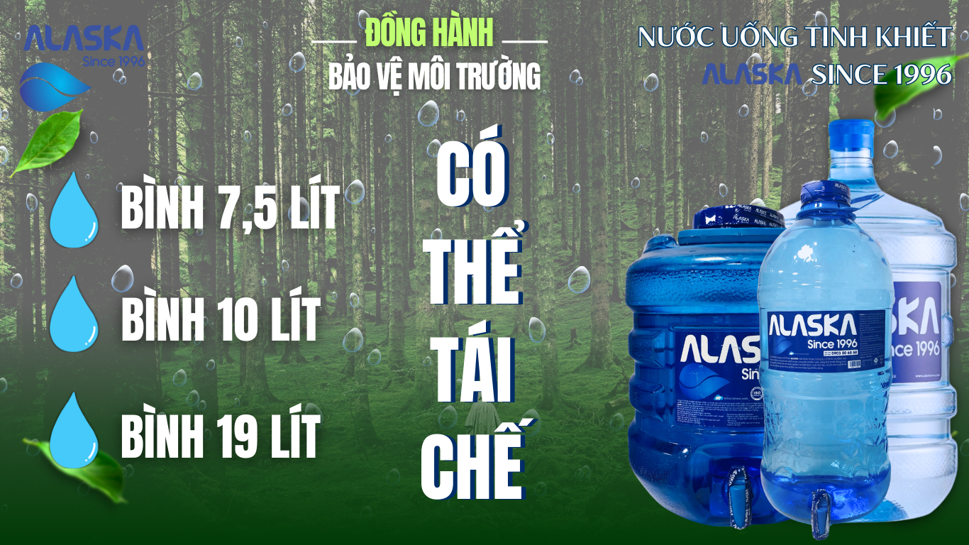 Alaska khuyến khích khách hàng sử dụng bình nước có thể tái sử dụng dung tích lớn như 7.5L, 10L và 19L, nhằm giảm thiểu sự lãng phí nhựa từ các chai nước nhỏ. Đặc biệt, các sản phẩm nước uống tinh khiết của Alaska đều được sản xuất theo tiêu chuẩn thân thiện với môi trường, hạn chế tối đa chất thải nhựa và sử dụng bao bì có thể tái chế.
