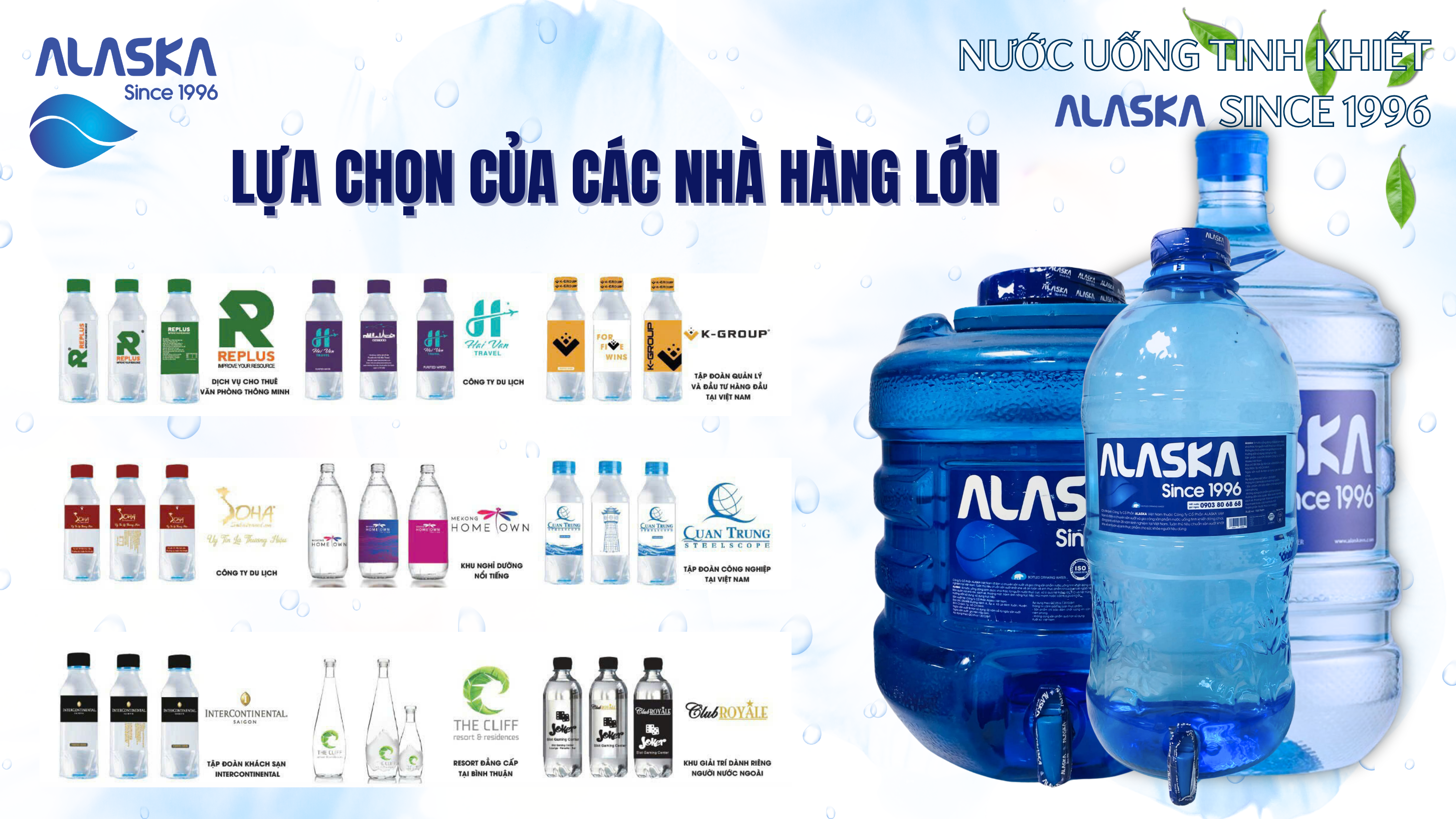 Không chỉ là lựa chọn của hàng triệu gia đình, ALASKA còn được tin dùng bởi các chuỗi khách sạn 5 sao và nhà hàng cao cấp. Với dây chuyền sản xuất hiện đại và quy trình kiểm soát chất lượng nghiêm ngặt, ALASKA đã trở thành thương hiệu hàng đầu trong lĩnh vực cung cấp nước tinh khiết cho các đối tác lớn.